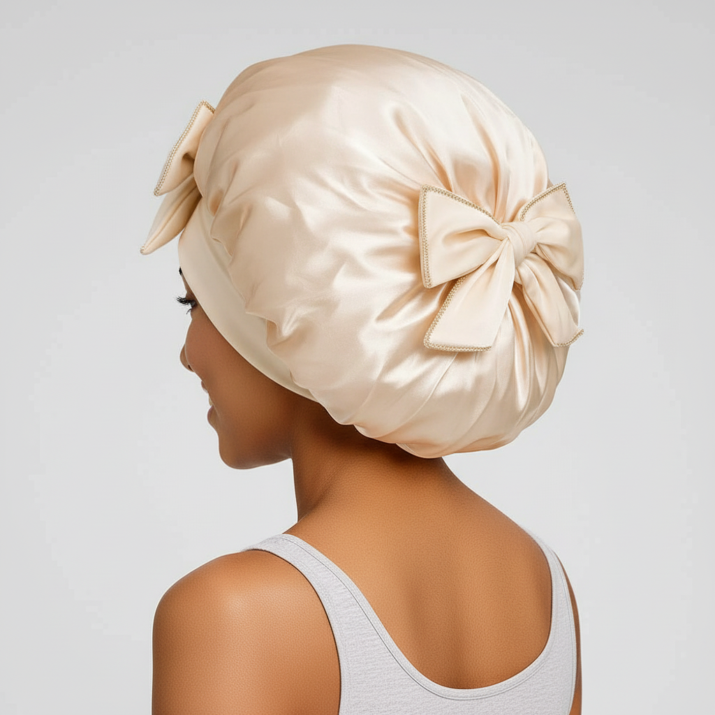 Ce bonnet en satin beige est un accessoire pour la tête conçu pour envelopper les cheveux. Il est pourvu d'un nœud décoratif positionné sur le dessus.