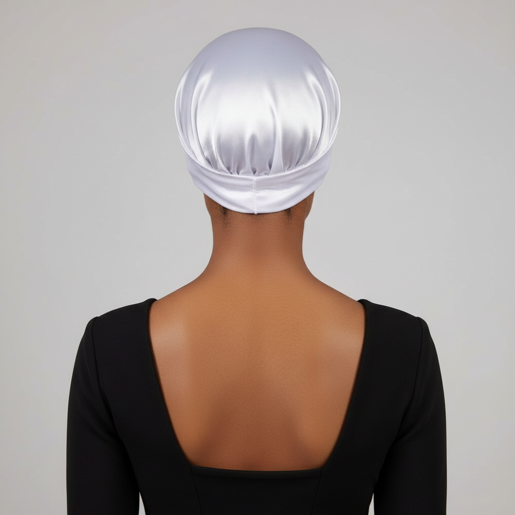 Ce bonnet en satin blanc est un accessoire capillaire conçu pour être porté durant le sommeil. Il enveloppe la chevelure afin de limiter les frottements mécaniques nocturnes.