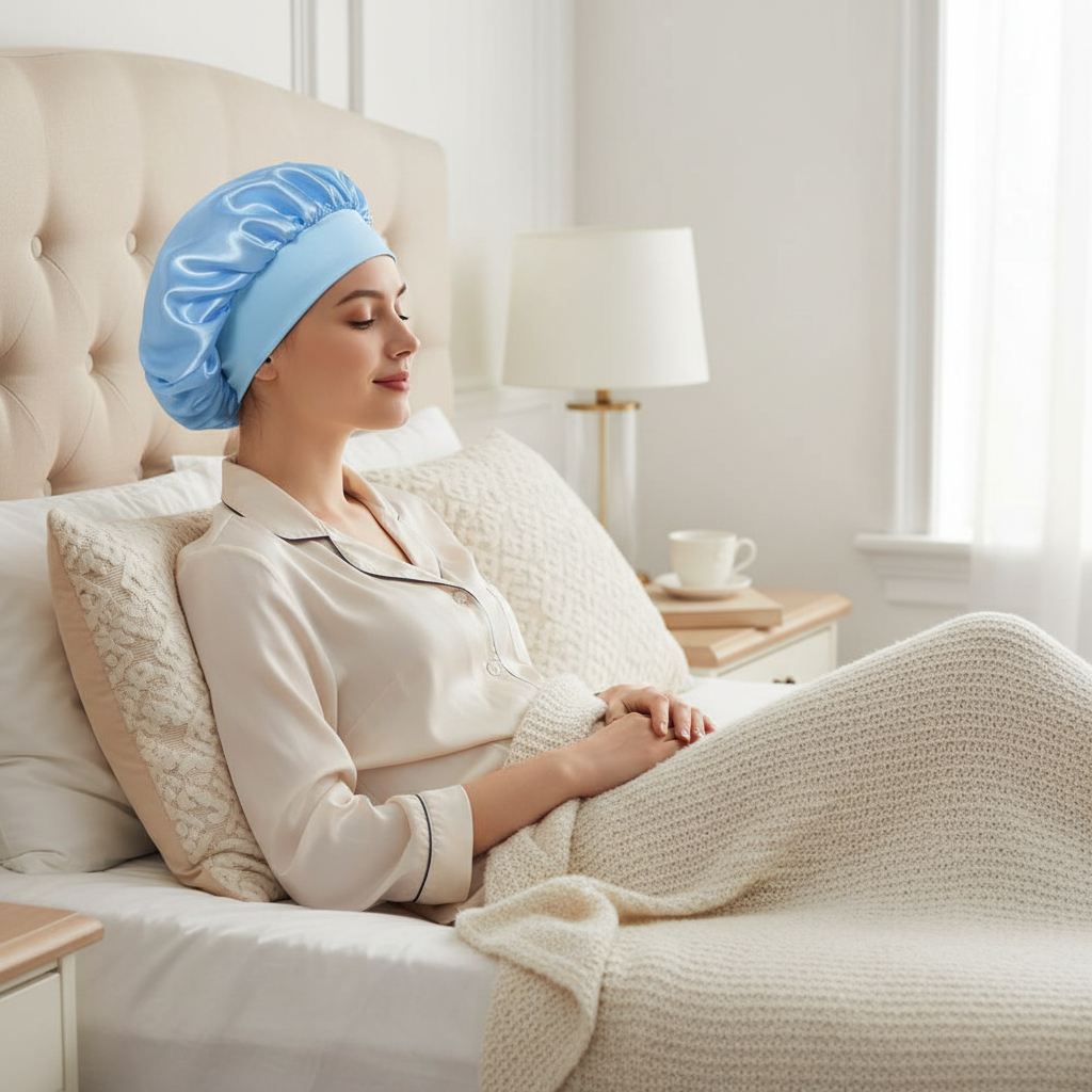 Ce bonnet est destiné à être porté pendant le sommeil. La surface lisse du tissu satiné contribue à réduire les frottements entre les cheveux et les surfaces de couchage. Il est conçu pour aider à maintenir les coiffures et à préserver l'hydratation des cheveux durant la nuit.