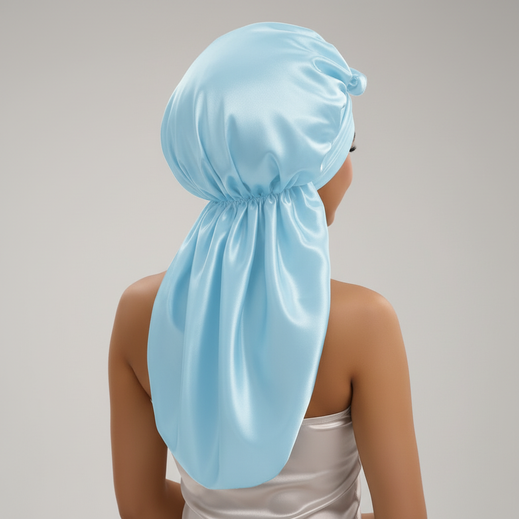 Ce bonnet en satin bleu clair est un couvre-cheveux conçu pour maintenir les cheveux longs. Il est destiné à une utilisation nocturne ou domestique.