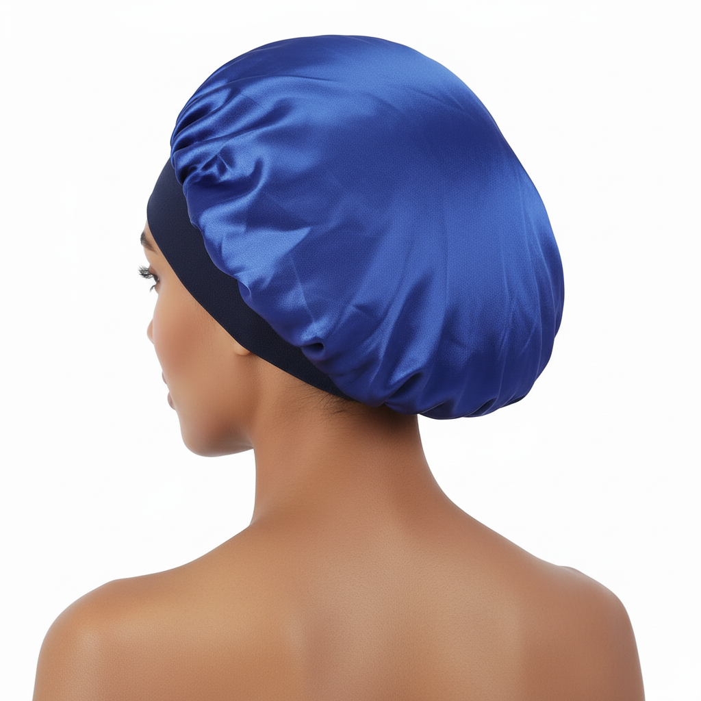 Ce bonnet est un accessoire capillaire conçu pour envelopper les cheveux. Il est doté d'une calotte en tissu satiné et d'un bandeau élastique pour le maintien sur la tête.