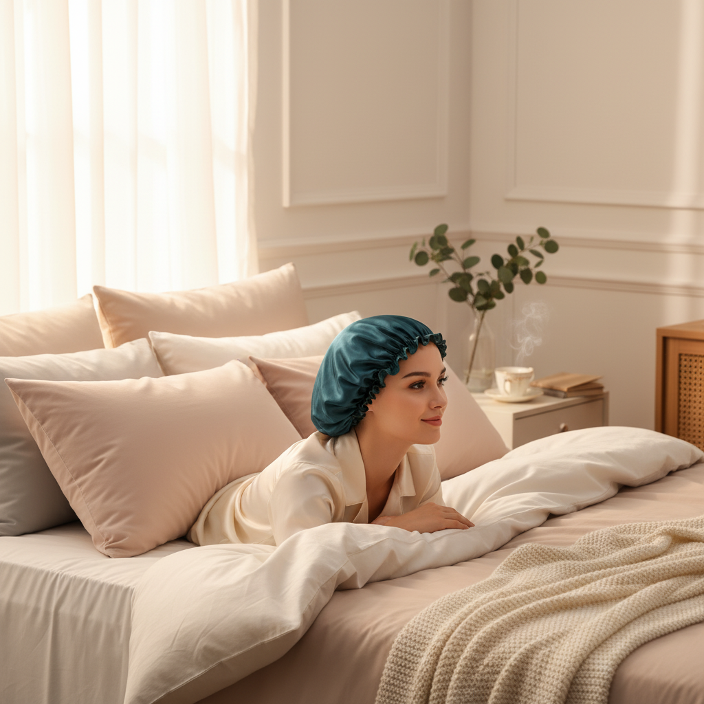 Bonnet En Satin Bleu Sarcelle Volanté Pour Cheveux : Protection Capillaire Nocturne