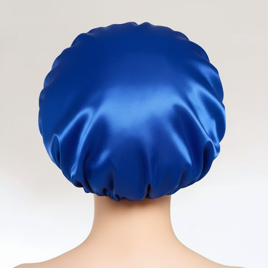 Ce bonnet en satin de couleur bleue est conçu pour couvrir la chevelure. Il est équipé d'un bandeau élastique pour un maintien sur la tête.
