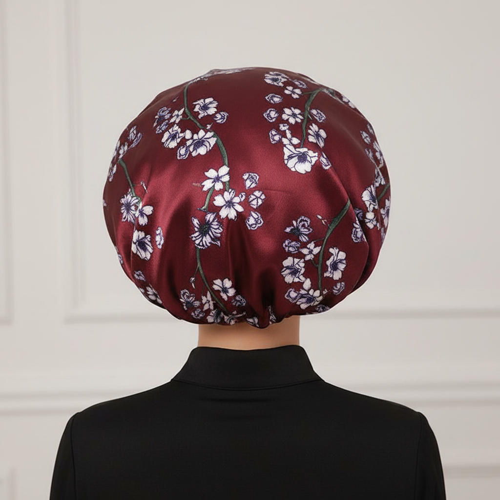 Ce bonnet en satin est conçu pour couvrir la chevelure. Il présente un motif floral sur un fond bordeaux et est équipé d'une bande élastique pour le maintien.