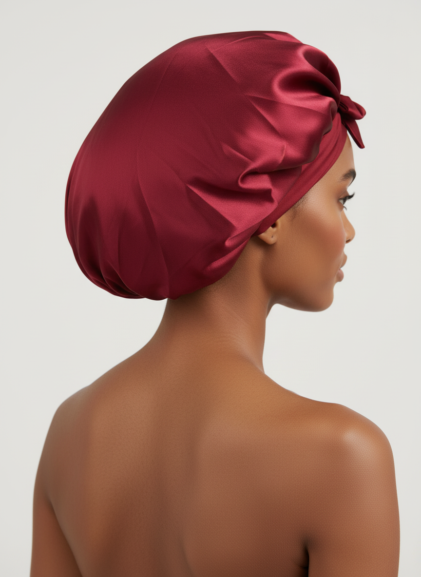 Le bonnet en satin est destiné à envelopper les cheveux pour réduire les frottements contre les surfaces de couchage durant la nuit. Cette action physique vise à aider au maintien de la coiffure et à limiter la perte d'hydratation des cheveux. Il se porte sur la tête, recouvrant l'ensemble de la chevelure avant le coucher.