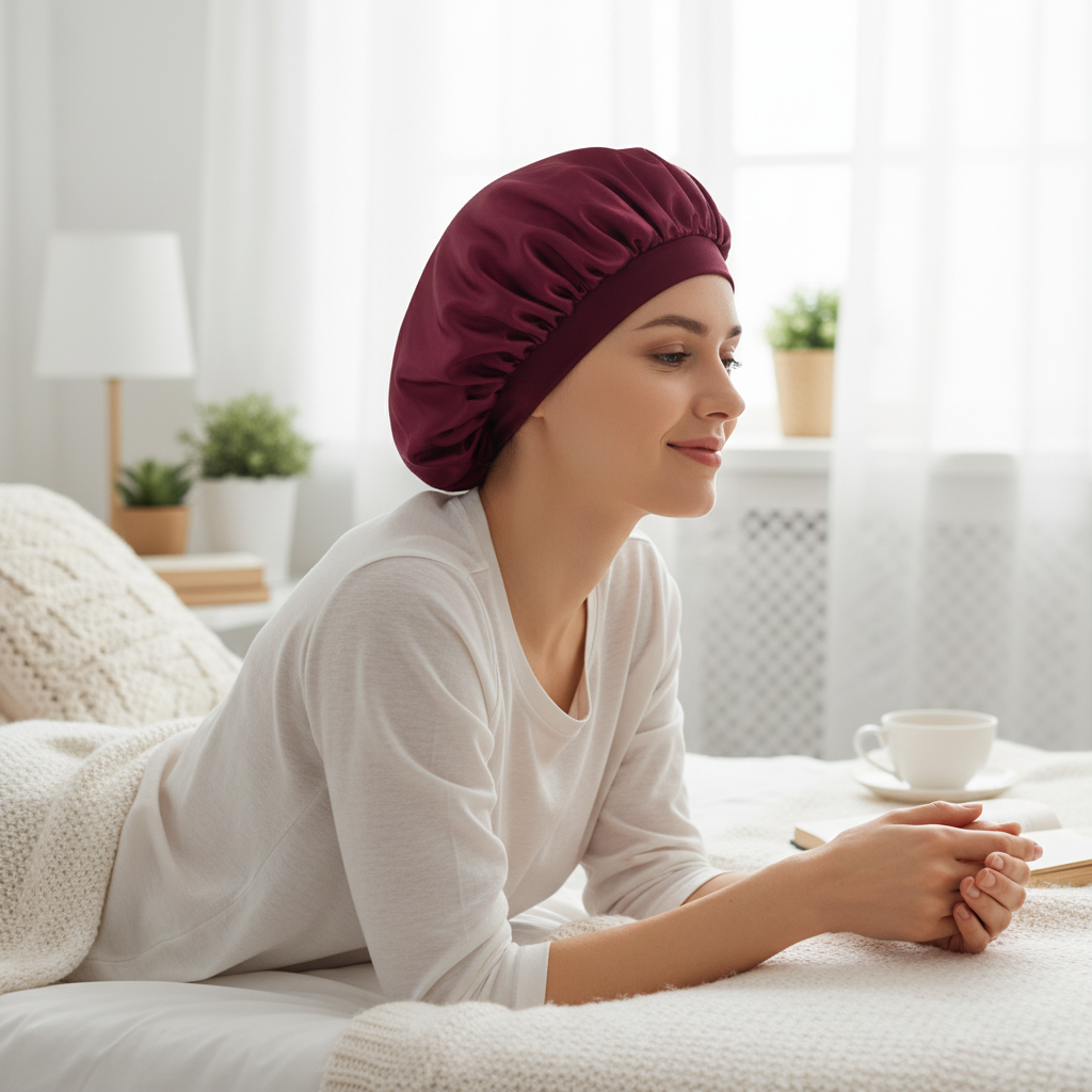 Ce bonnet est un accessoire conçu pour couvrir les cheveux pendant le sommeil. Il est fabriqué en tissu satiné de couleur bordeaux et intègre une bande élastique pour le maintien.