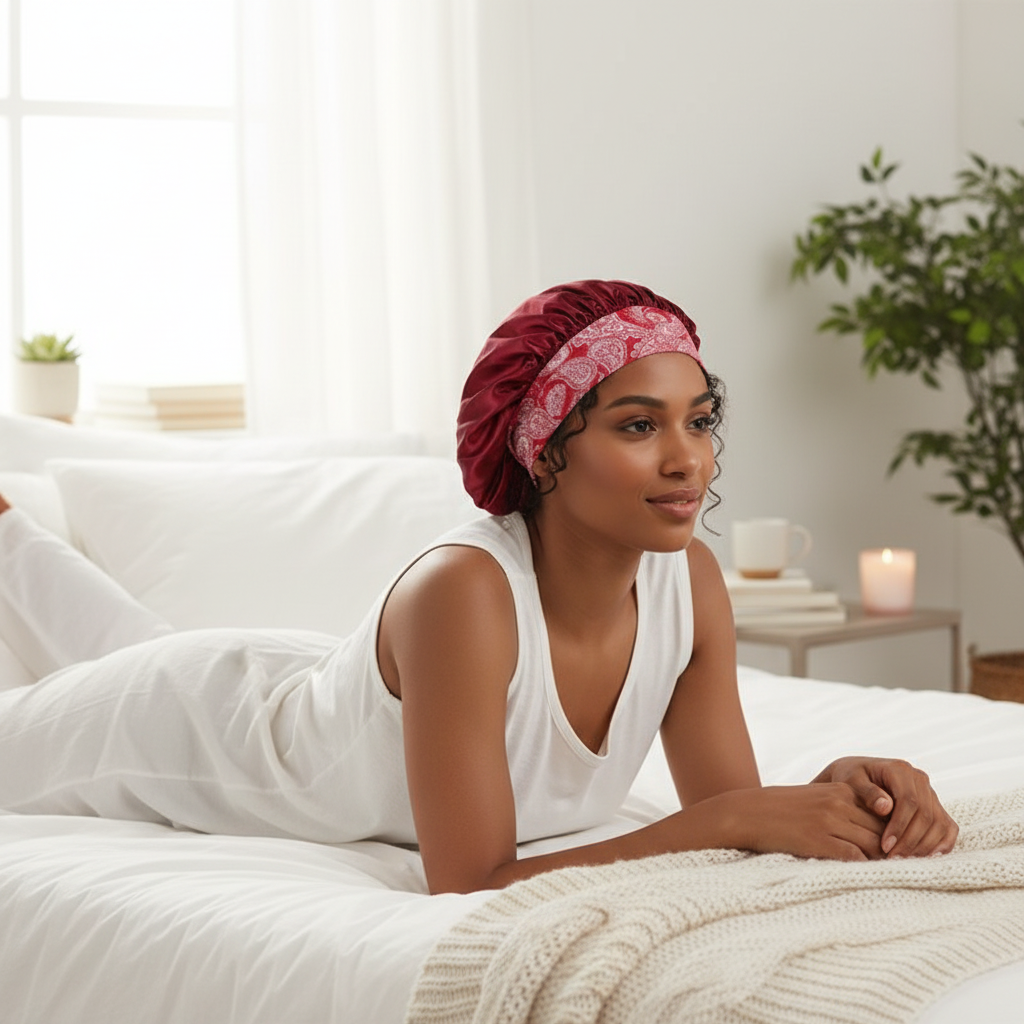 Ce bonnet est un accessoire capillaire conçu pour maintenir et couvrir les cheveux. Il est fabriqué en satin et se caractérise par une couleur bordeaux avec un bandeau à motif cachemire.