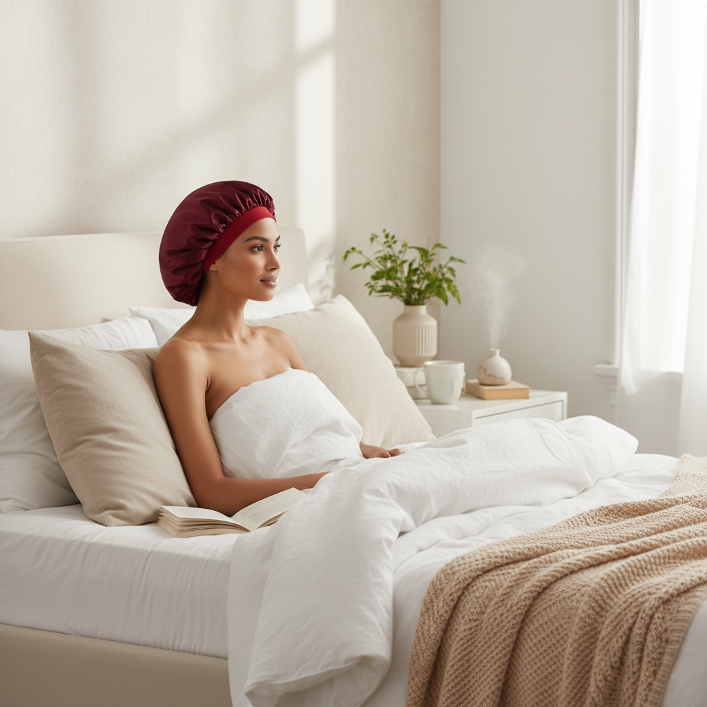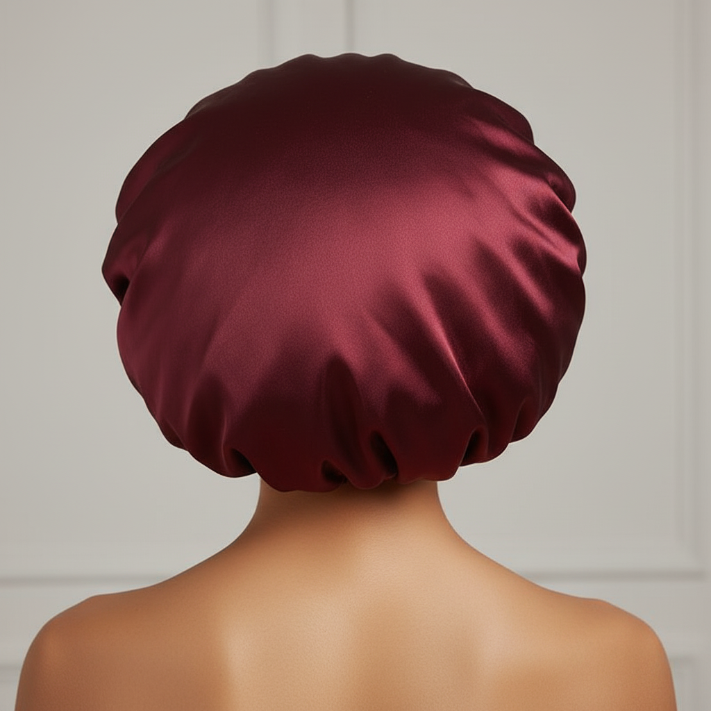 Protégez vos cheveux avec élégance grâce à notre bonnet de nuit en satin bordeaux, conçu pour un soin capillaire optimal.