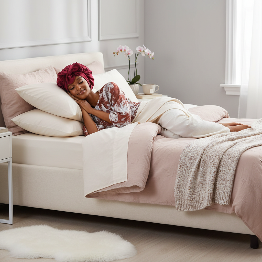 Ce bonnet de nuit est destiné à envelopper les cheveux pendant le sommeil. Sa surface lisse aide à minimiser les frottements entre les cheveux et l'oreiller, ce qui peut contribuer à réduire la casse et les frisottis. Il participe également au maintien de l'hydratation naturelle des cheveux et à la protection des coiffures.