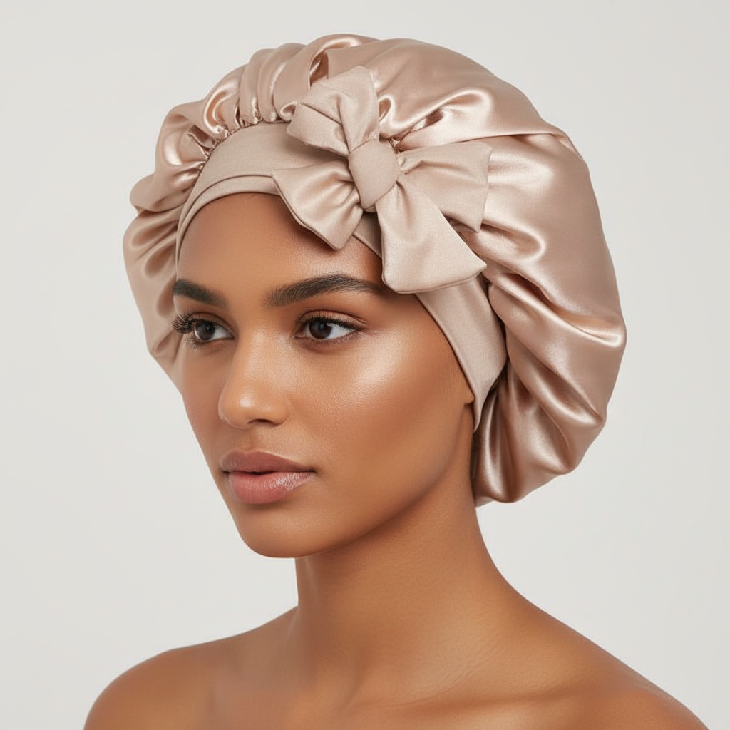 Ce bonnet est un accessoire de nuit conçu pour couvrir la chevelure. Il est fabriqué en satin de polyester et intègre un nœud décoratif sur le devant. Sa conception inclut un élastique pour l'ajustement.