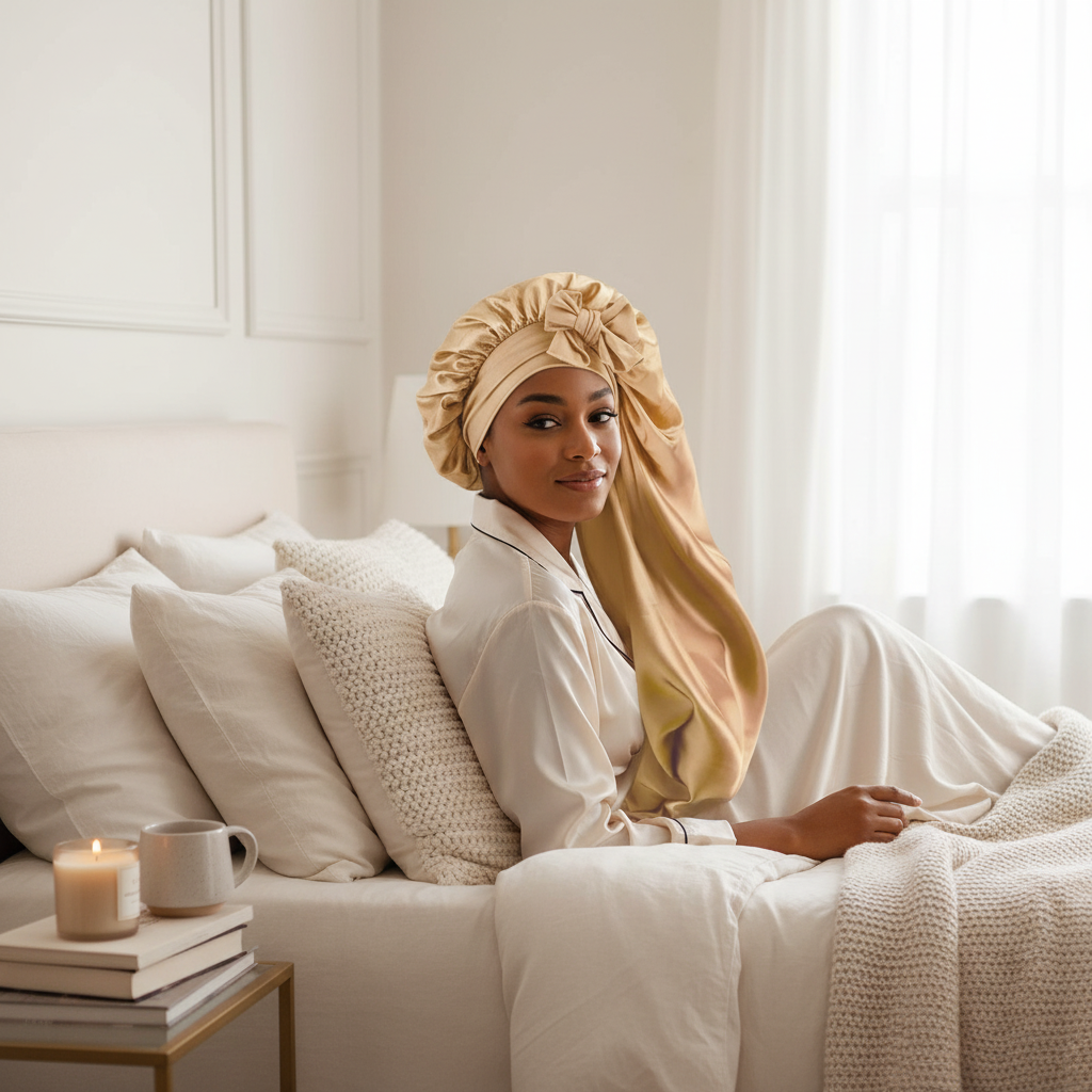 Ce bonnet est utilisé pour contenir les cheveux pendant la nuit. Sa surface lisse vise à réduire le frottement des cheveux contre les surfaces de couchage. Il est conçu pour une utilisation quotidienne.