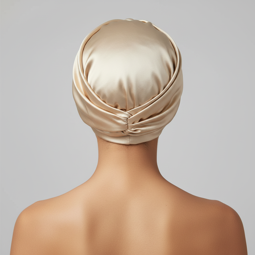 Protégez vos cheveux avec style grâce à ce bonnet en satin doré, conçu pour allier élégance et soin.