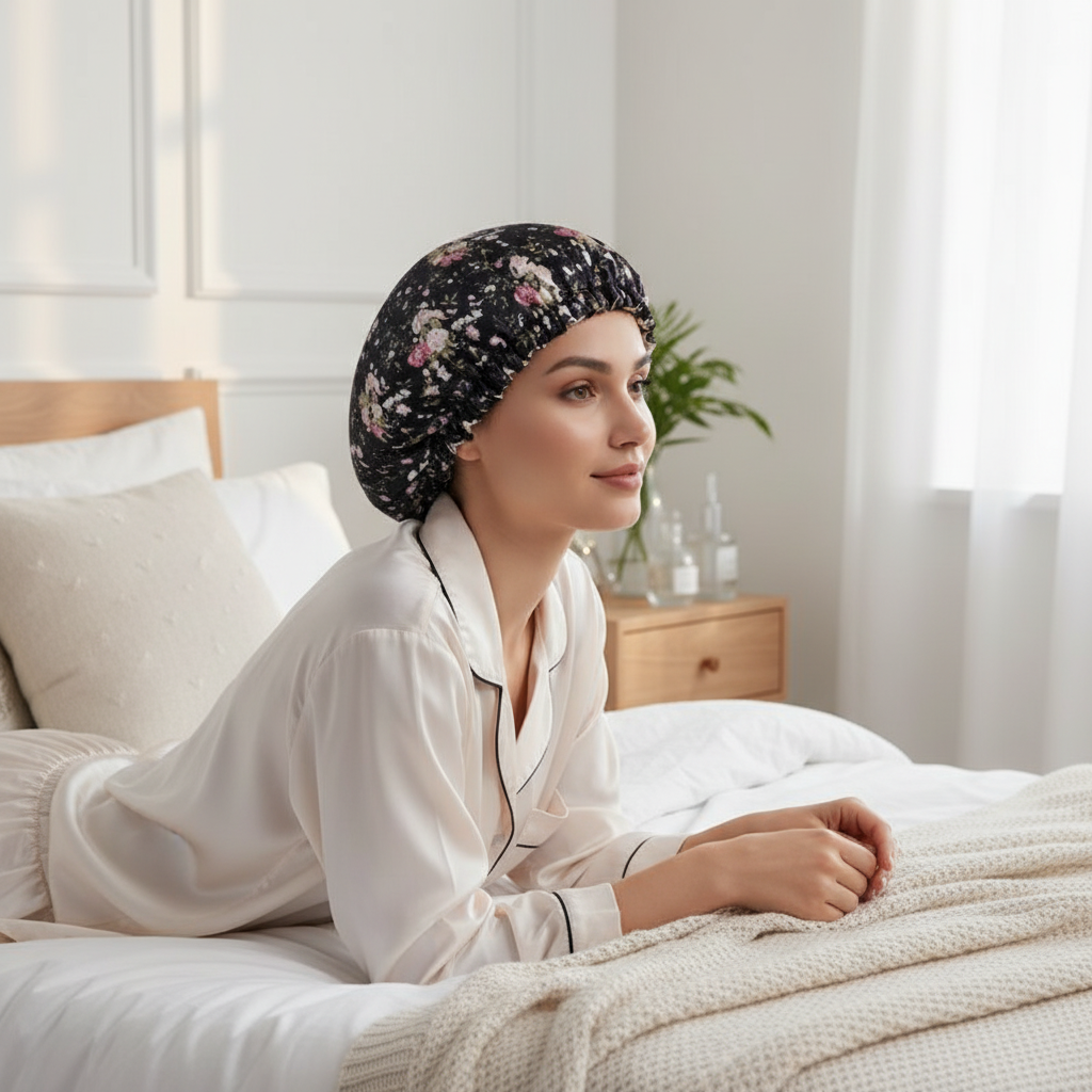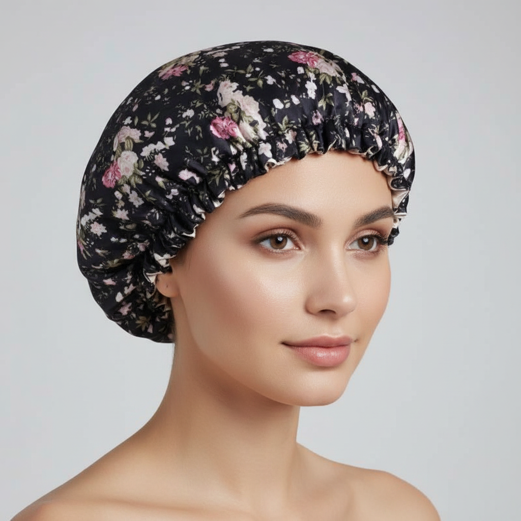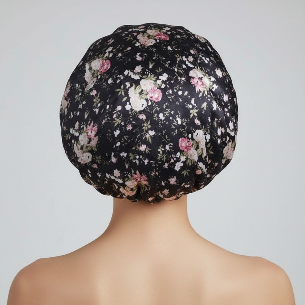 Ce bonnet de nuit est un accessoire capillaire en tissu satiné avec un motif floral. Il est conçu pour couvrir la chevelure pendant le sommeil.