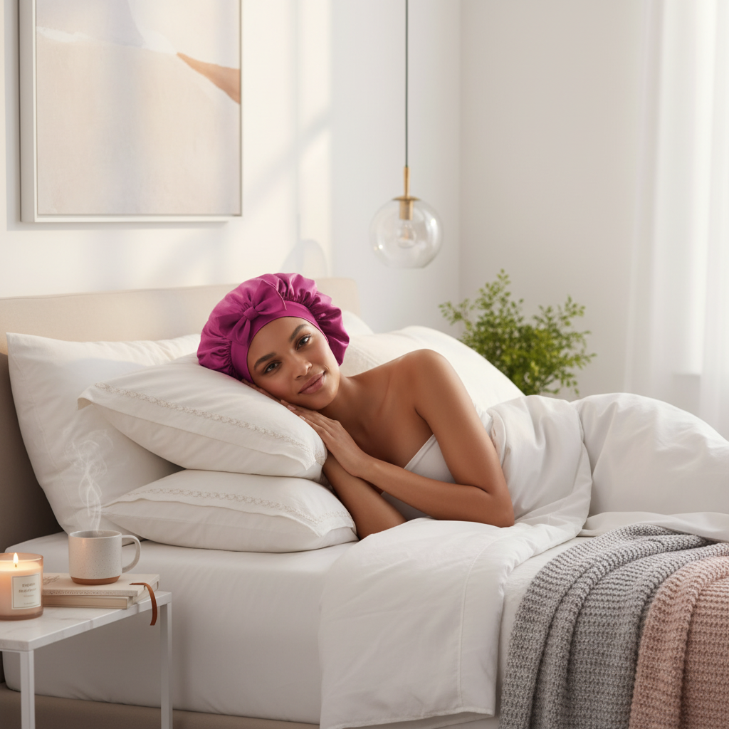 Un bonnet de nuit en satin de couleur fuchsia, doté d'une bande élastique et d'un nœud décoratif. Il est conçu pour couvrir les cheveux durant le sommeil.
