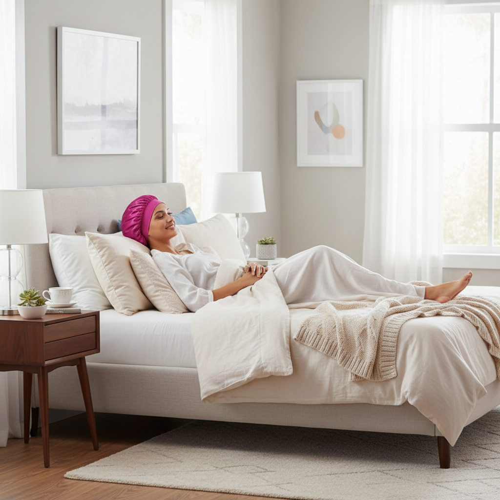 Le bonnet en satin est utilisé pour protéger les cheveux pendant la nuit. Sa surface lisse aide à réduire le frottement des cheveux contre la literie, ce qui peut contribuer à limiter la casse mécanique et à maintenir l'hydratation capillaire. Il permet également de préserver les coiffures.
