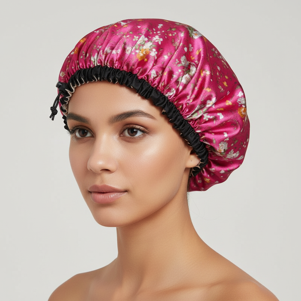 Bonnet En Satin Fuchsia Fleuri Réversible Nuit