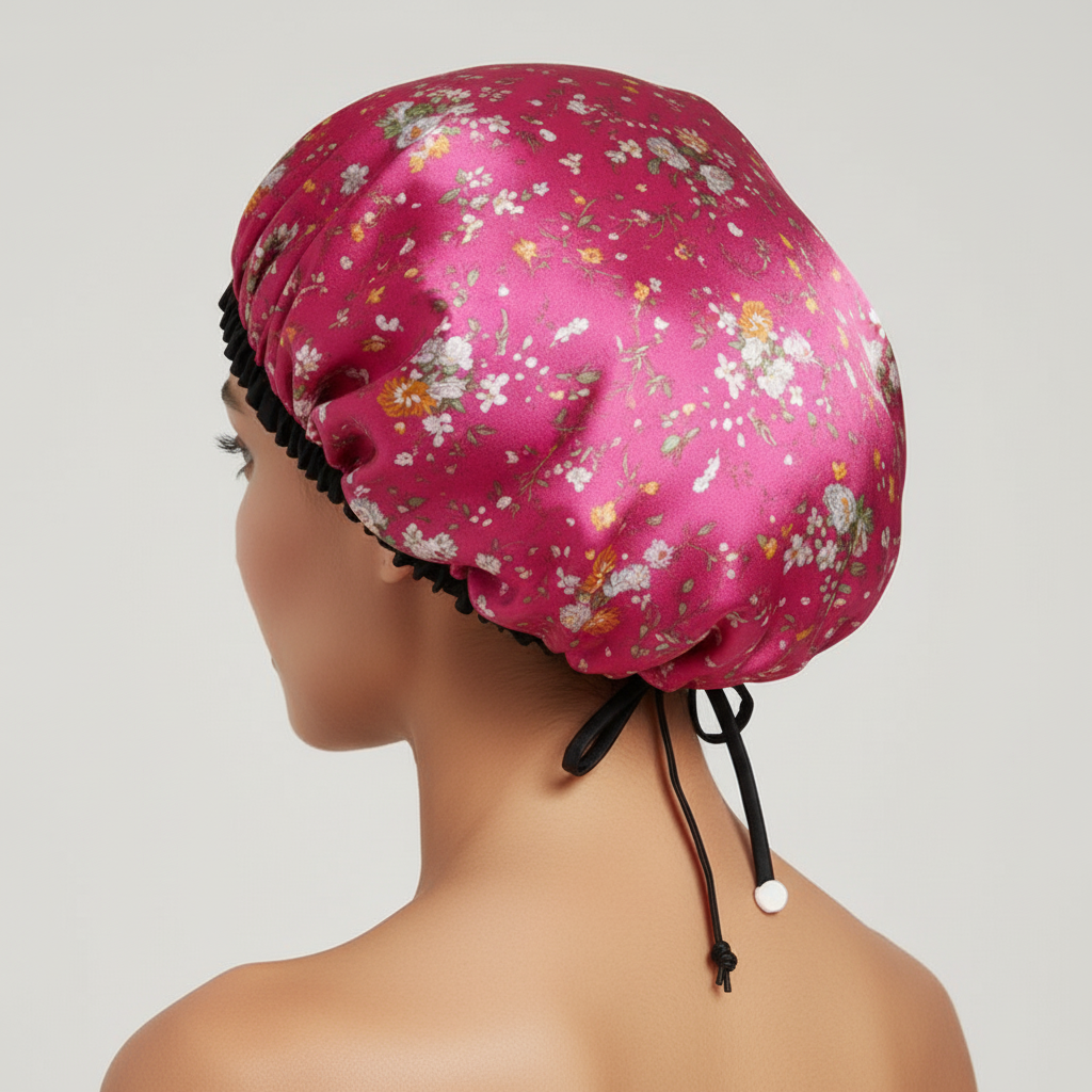 Découvrez la qualité et le réalisme de notre Bonnet En Satin Fuchsia Fleuri Réversible Nuit. Parfaite pour s’entraîner à la coiffure, développer sa créativité et réaliser des styles variés comme en salon professionnel.