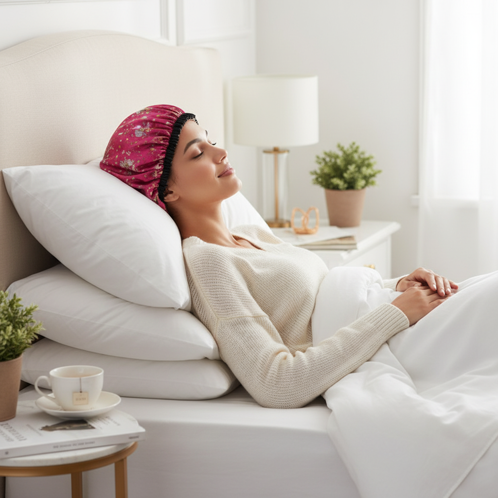 Le bonnet est utilisé pour envelopper les cheveux afin de limiter les frottements avec la literie durant la nuit. Sa surface lisse contribue à réduire les accrocs et à préserver la coiffure. Le système d'ajustement permet de l'adapter à différentes circonférences de tête et volumes capillaires.
