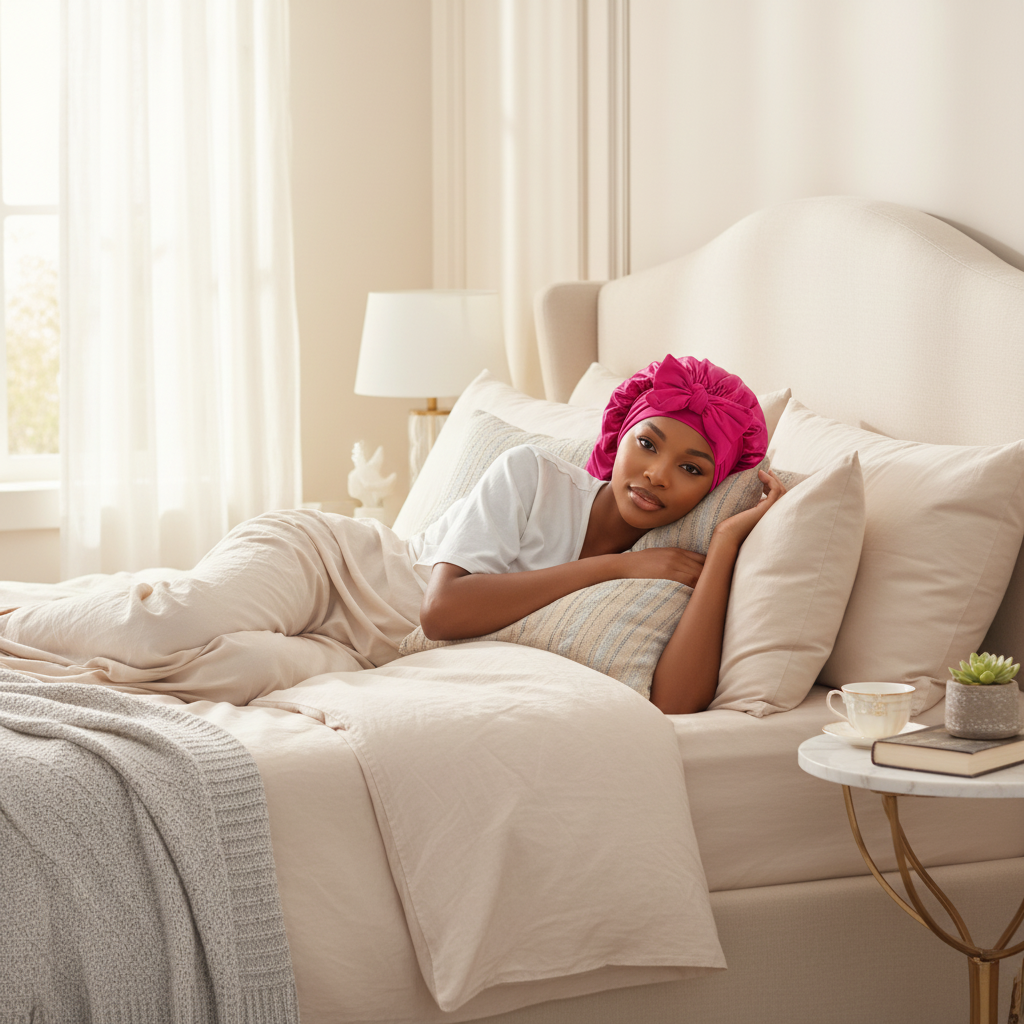 Le bonnet est porté pendant la nuit pour couvrir les cheveux. La matière satinée vise à minimiser les frottements des mèches contre les surfaces, aidant ainsi à préserver la coiffure et l'hydratation capillaire.