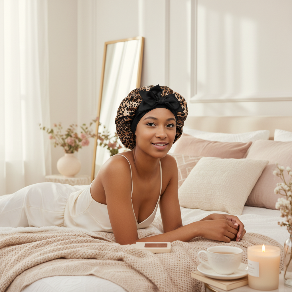 Un bonnet en satin conçu pour la protection des cheveux durant la nuit. Il est doté d'un imprimé léopard et d'un nœud décoratif noir.