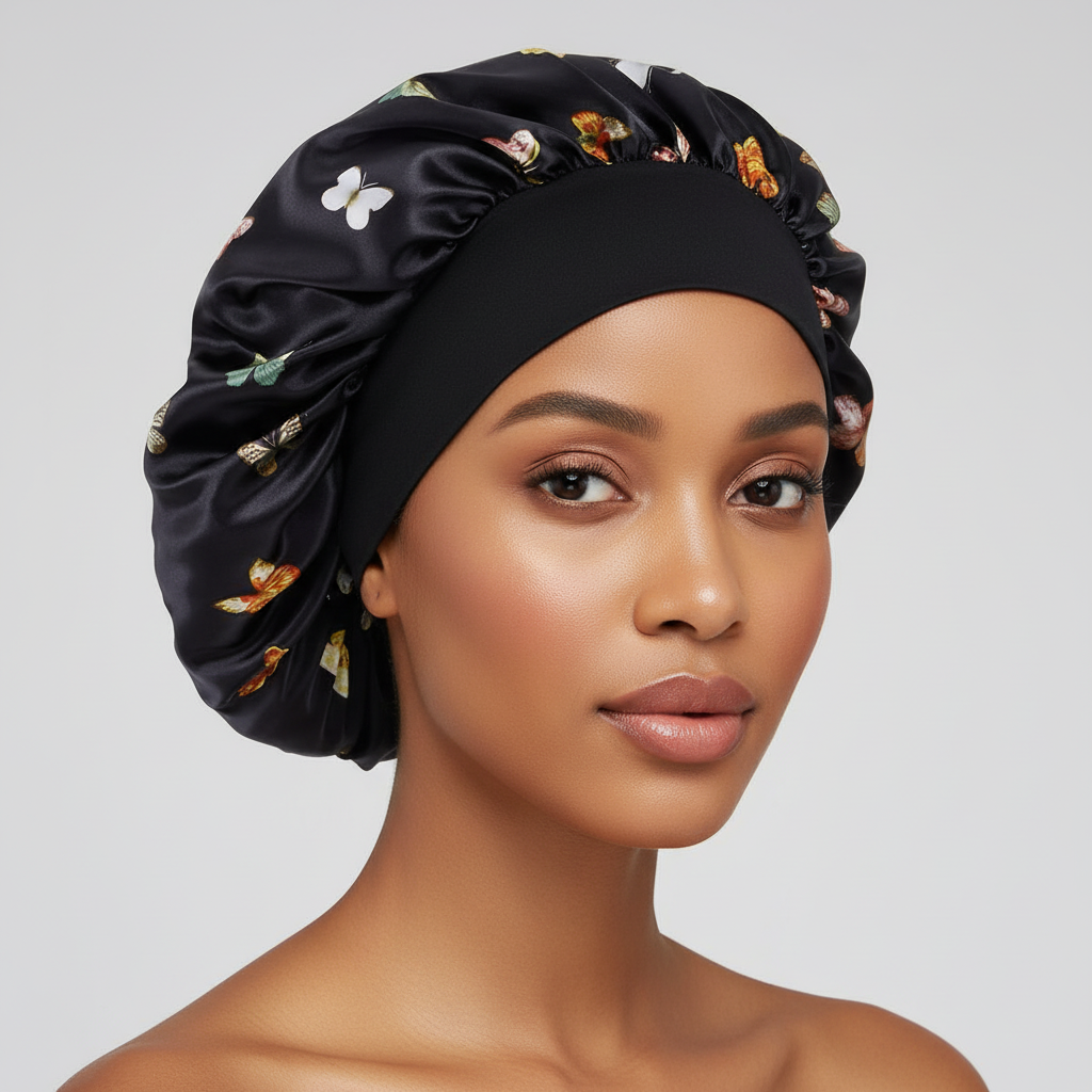 Bonnet en satin à motifs papillons, conçu pour couvrir et envelopper les cheveux.