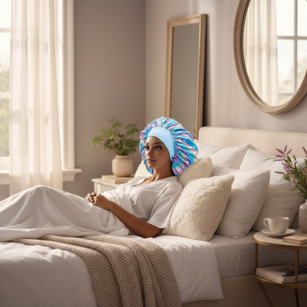 Ce bonnet est utilisé pour maintenir les cheveux couverts. Sa conception en satin vise à limiter le frottement des cheveux avec l'oreiller durant le sommeil. Le bandeau élastique intégré assure le maintien du bonnet sur la tête.
