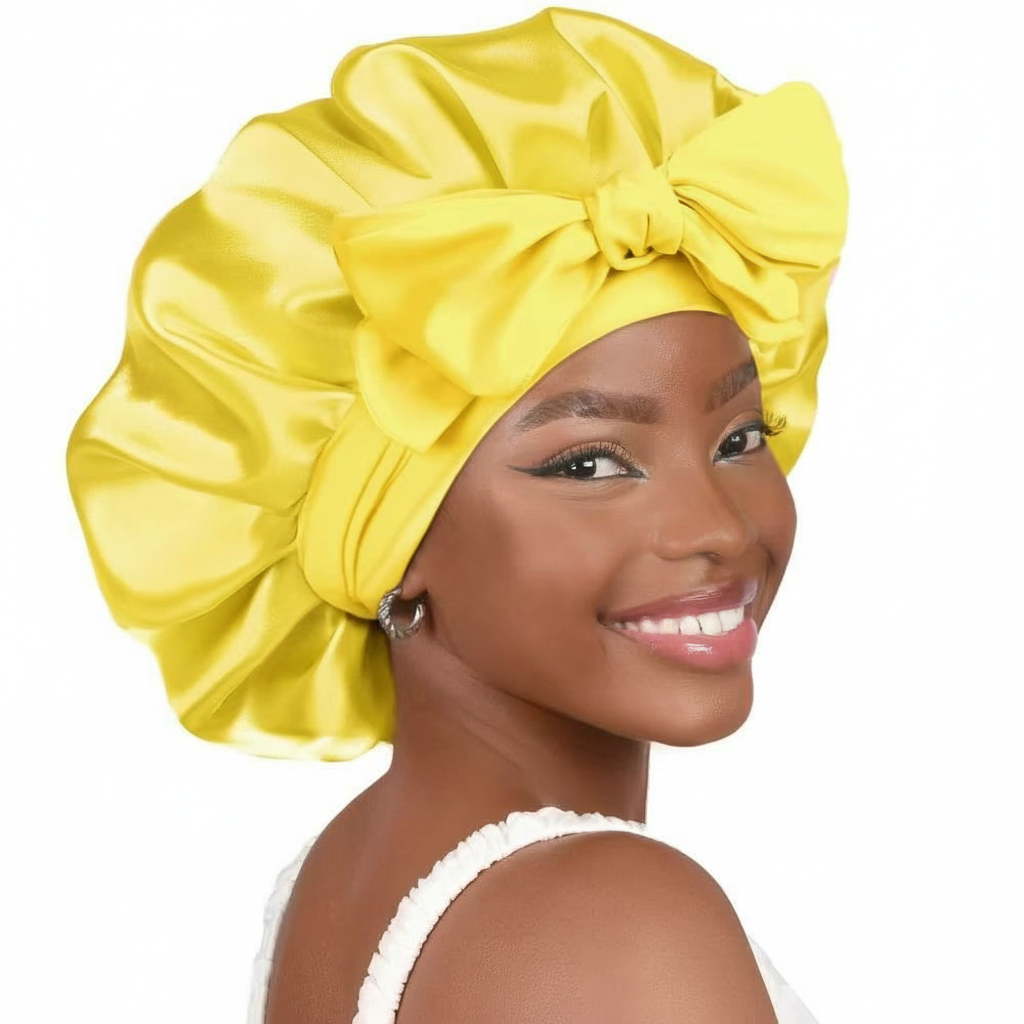Bonnet En Satin Jaune À Nœud Nuit : Protection Capillaire Nocturne