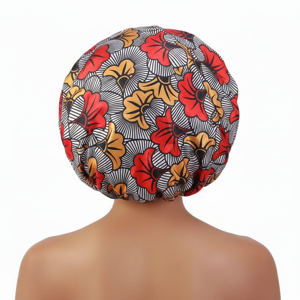 Le bonnet en satin large imprimé africain est un accessoire de nuit conçu pour envelopper les cheveux. Il présente un motif inspiré de l'art africain et intègre une bande élastique pour le maintien.