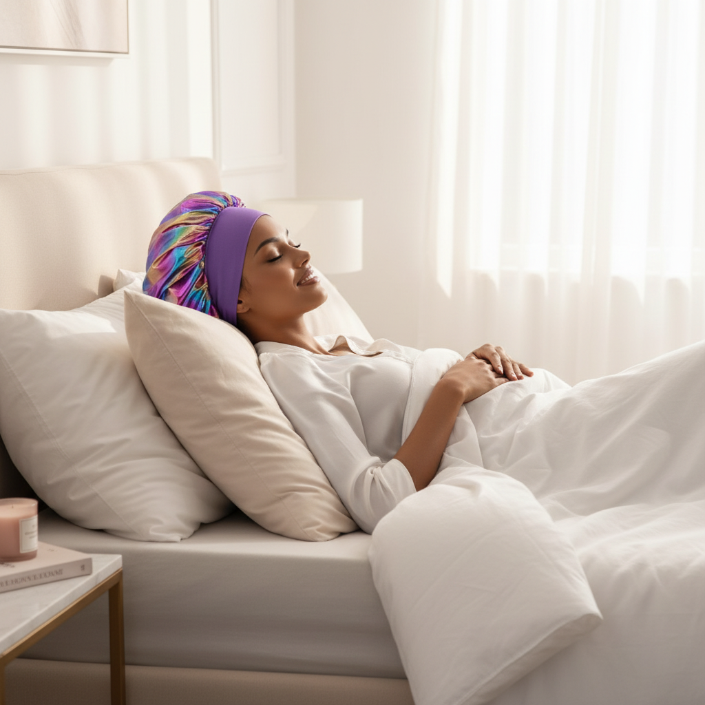 Ce bonnet est destiné à couvrir les cheveux pendant la nuit. Sa surface en satin aide à réduire les frictions avec les surfaces de couchage, ce qui peut contribuer à limiter l'apparition de frisottis et de nœuds. Il est conçu pour maintenir les coiffures en place.