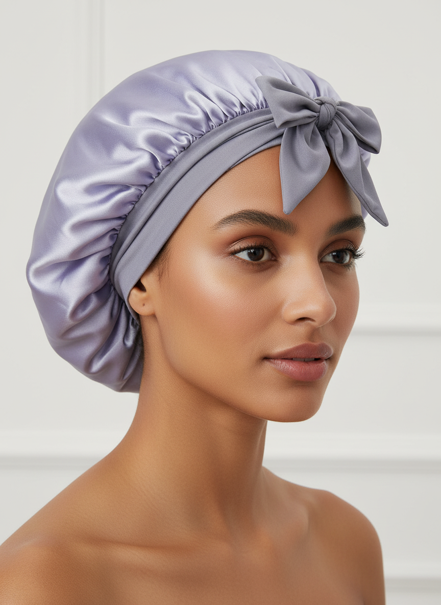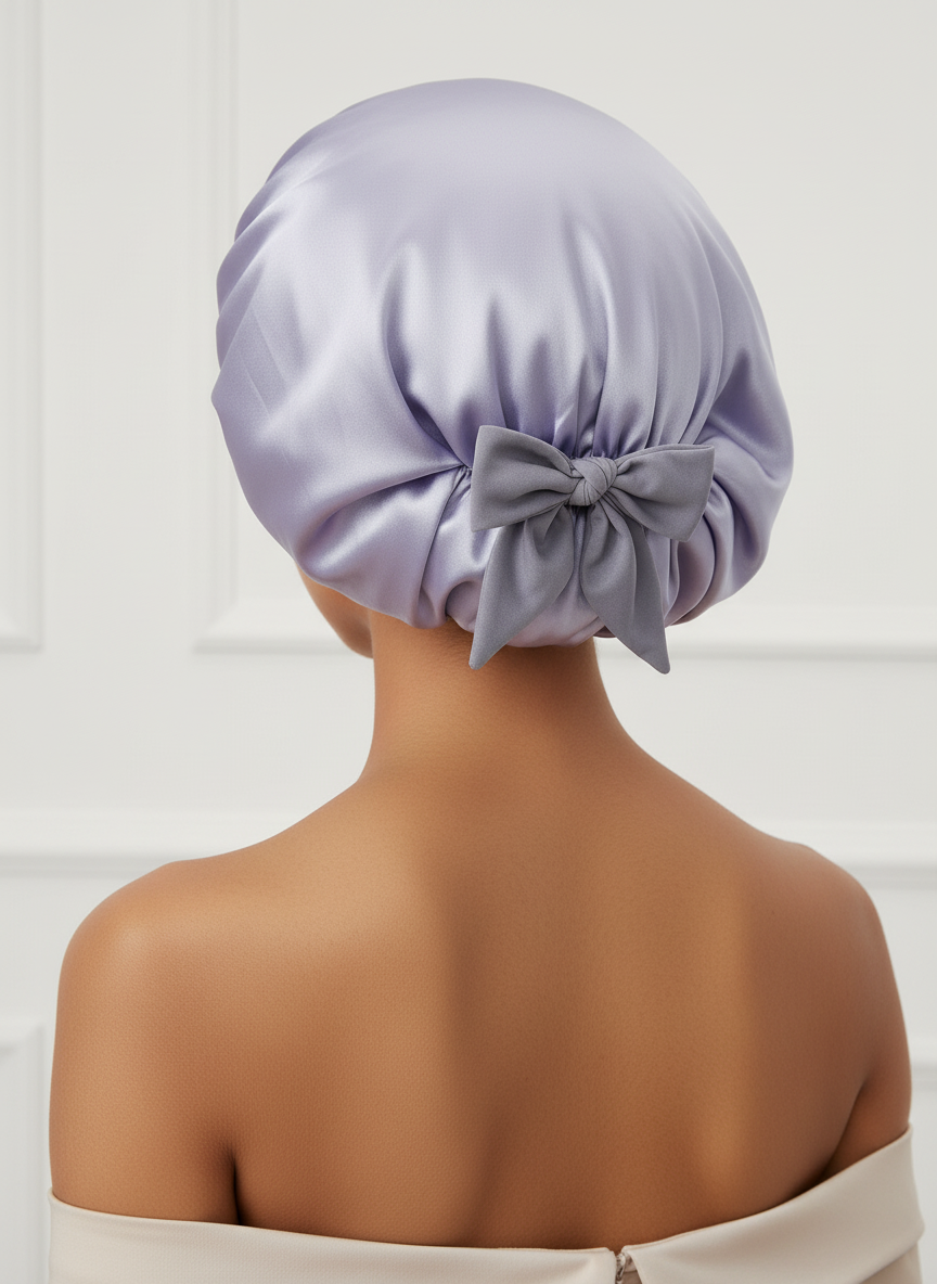 Ce bonnet en satin de couleur lavande est conçu pour être porté sur la tête. Il est doté d'un nœud décoratif et d'une bande élastique pour le maintien.