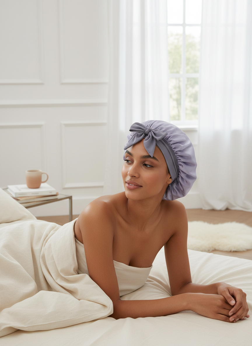 L'objectif de ce bonnet est de maintenir les cheveux contenus et de réduire le contact direct entre la chevelure et les surfaces telles que l'oreiller.