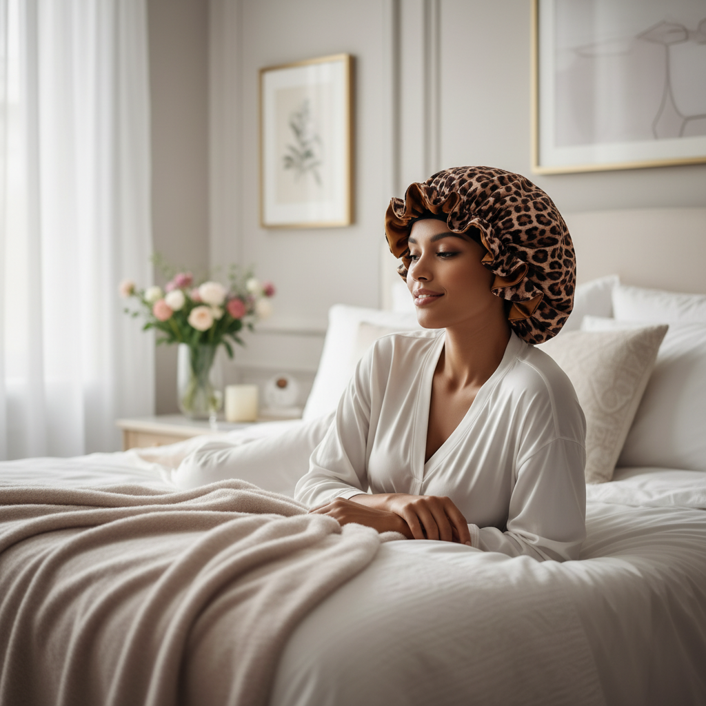 Ce bonnet de nuit est fabriqué en satin double couche et présente un motif léopard. Il est conçu pour couvrir la chevelure durant le sommeil.