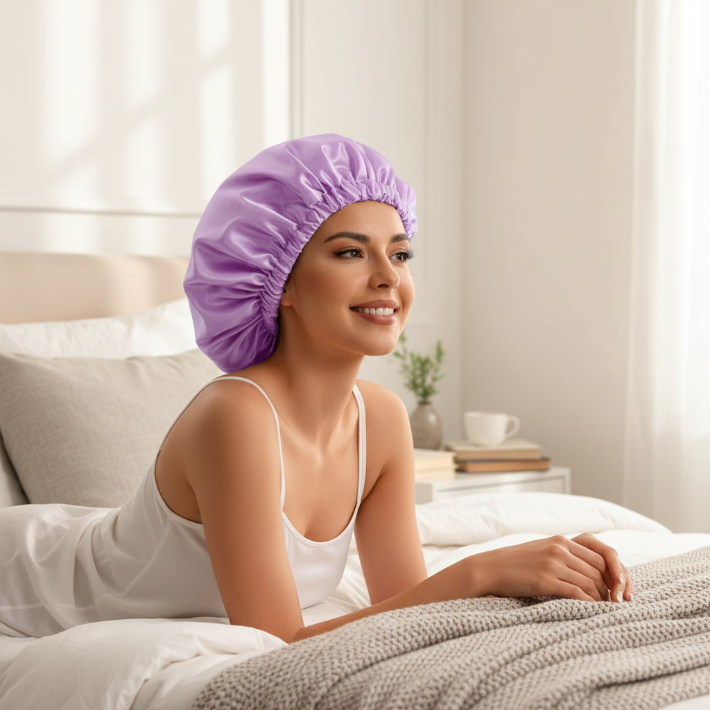 Protégez vos cheveux pendant votre sommeil avec notre bonnet de nuit en satin large et doux.