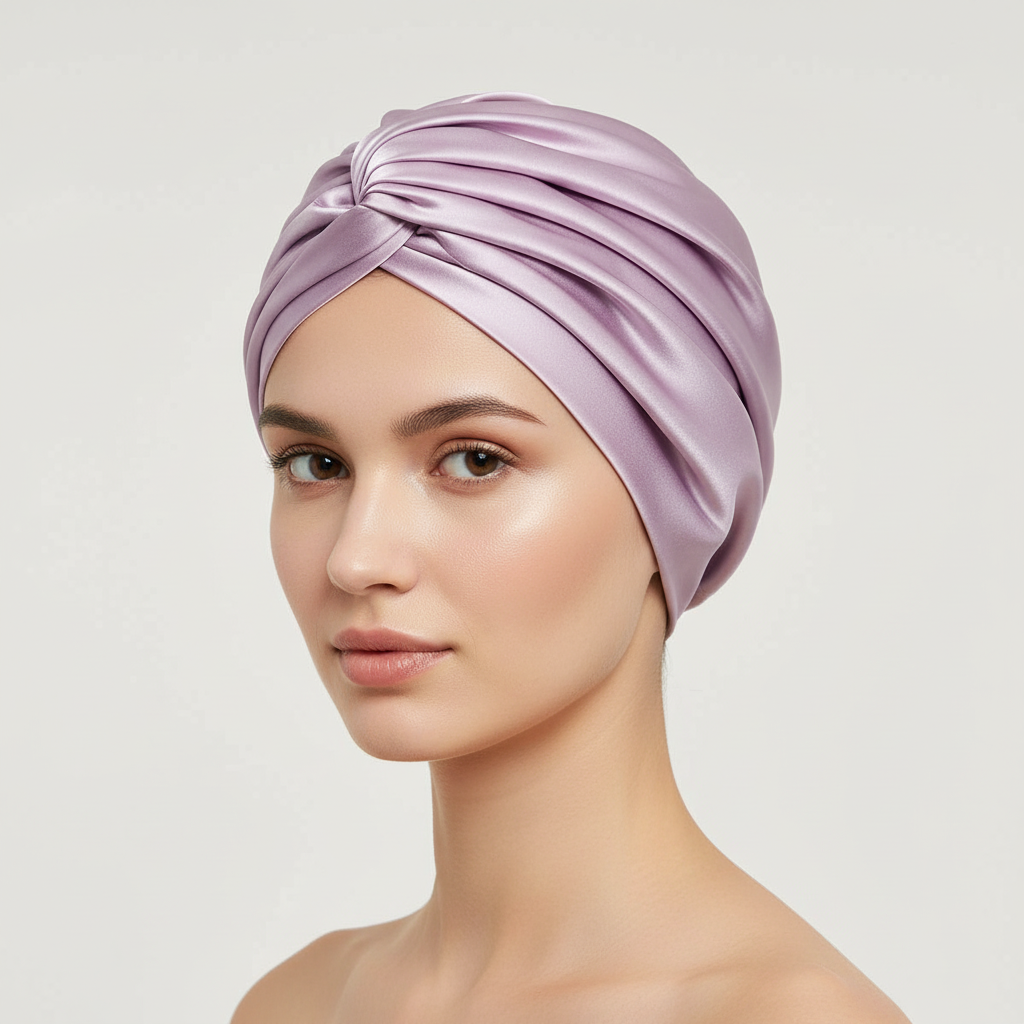 Ce bonnet en satin de couleur lilas est un accessoire capillaire conçu pour une utilisation nocturne. Il présente une conception torsadée sur le devant et un bord élastique pour un maintien sur la tête.