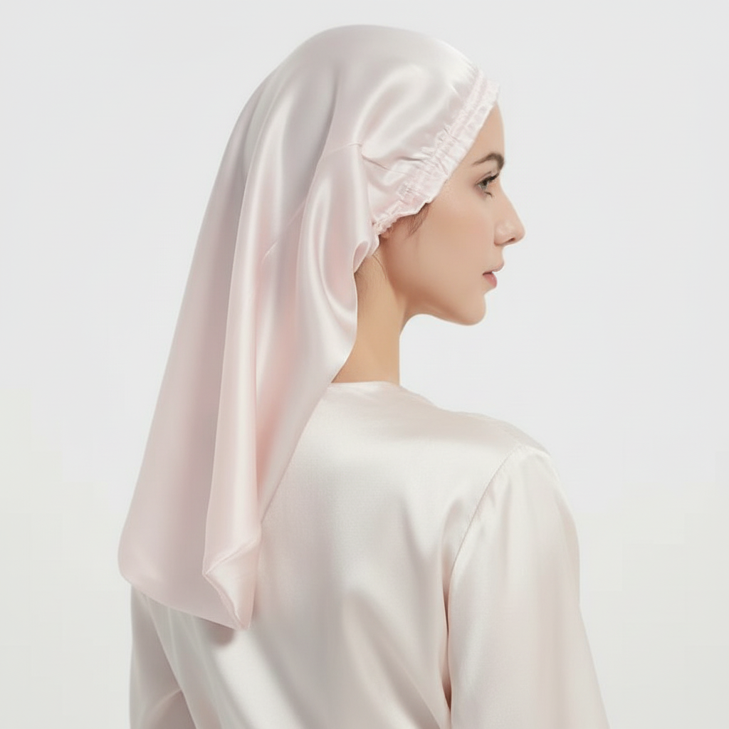 Ce bonnet de nuit en satin est conçu pour la couverture des cheveux durant le sommeil. Il présente une forme longue et une couleur rose.