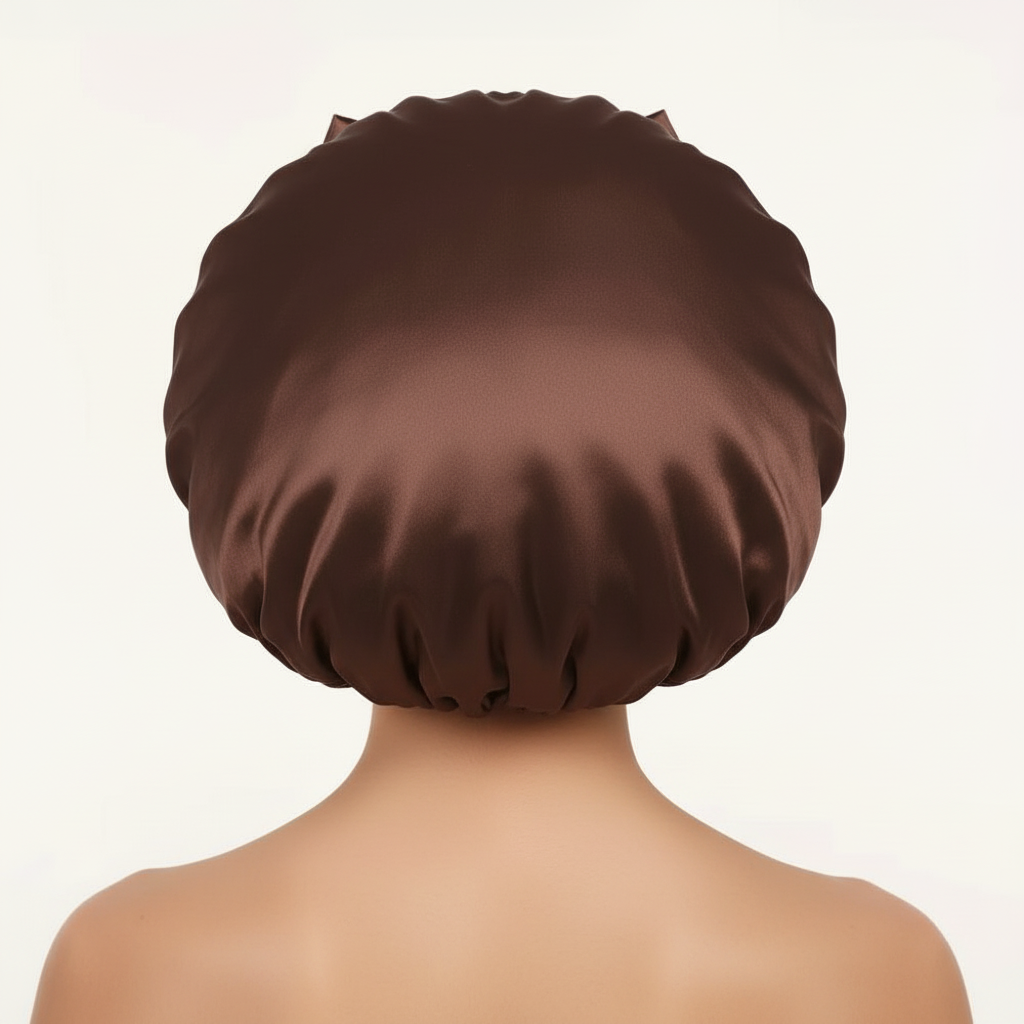 Un bonnet de nuit en satin de couleur marron, doté d'un nœud décoratif à l'avant. Cet accessoire est conçu pour couvrir les cheveux pendant le sommeil.