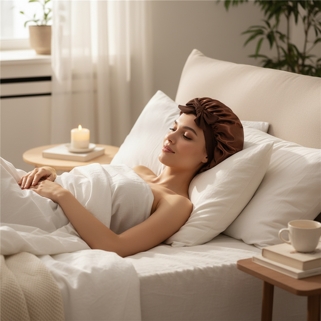 Bonnet De Nuit En Satin Marron Avec Nœud Décoratif