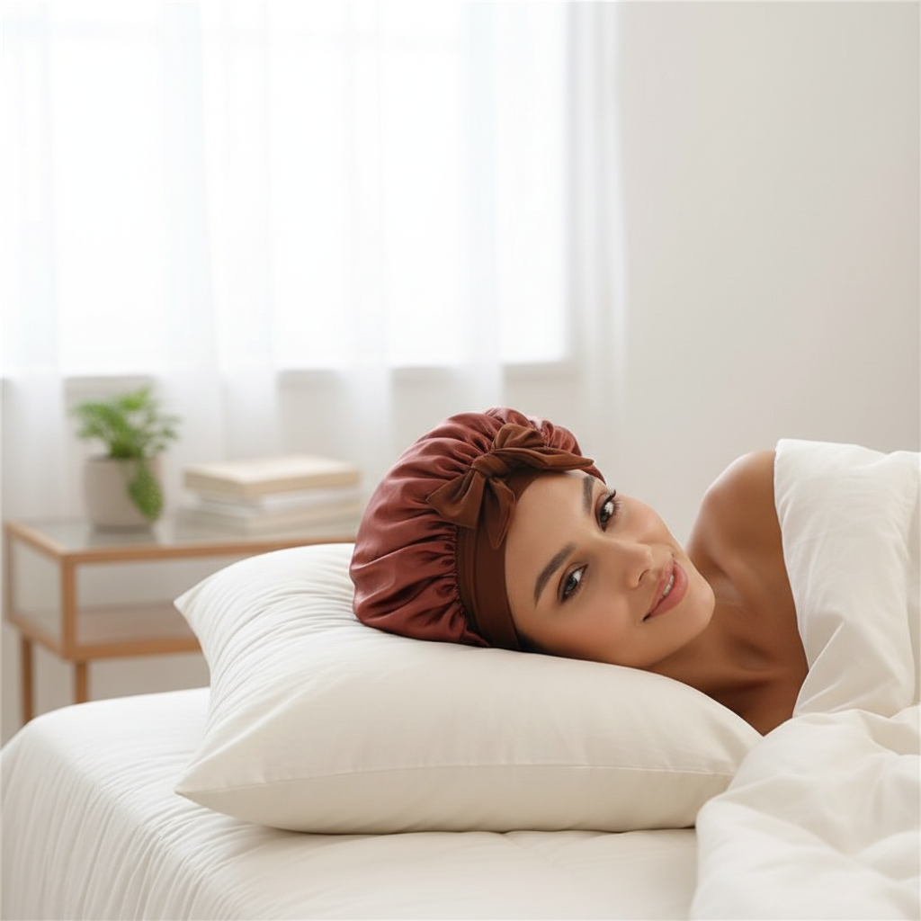 Bonnet En Satin Marron Avec Nœud Réglable Nuit
