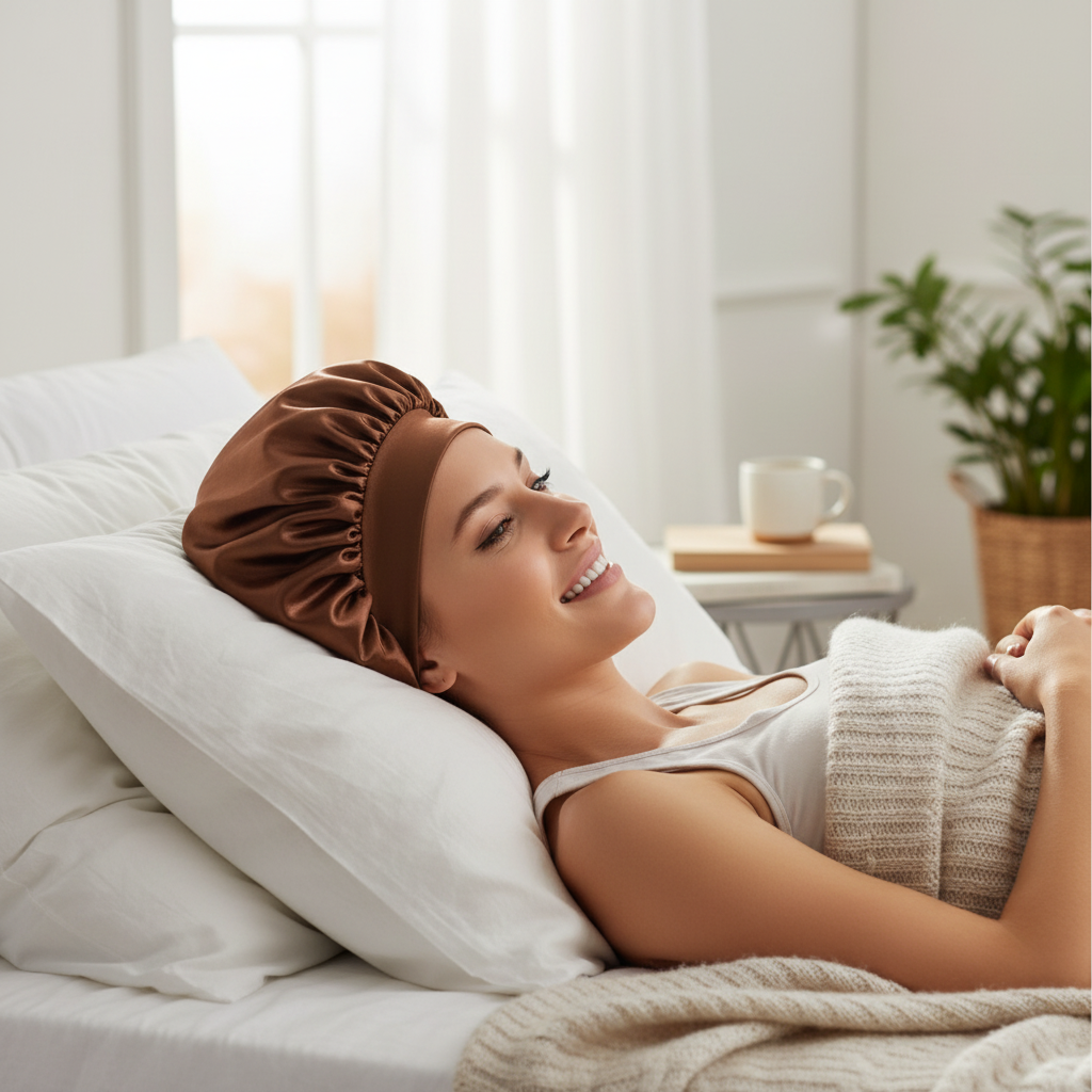 Ce bonnet de nuit est conçu pour couvrir les cheveux pendant le sommeil ou la détente. Sa confection en satin vise à réduire le frottement des cheveux contre les surfaces.