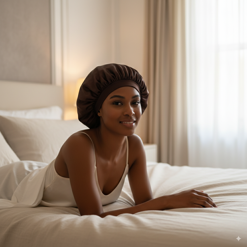 Un bonnet de nuit en tissu satiné de couleur marron, conçu pour envelopper et maintenir les cheveux. Il est doté d'une bande élastique pour un ajustement sur le pourtour de la tête.