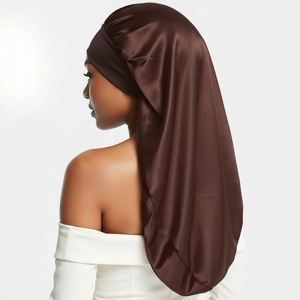Ce bonnet est un accessoire capillaire en satin, de couleur marron. Il est conçu pour envelopper les cheveux longs et est équipé d'une bande élastique pour le maintien.