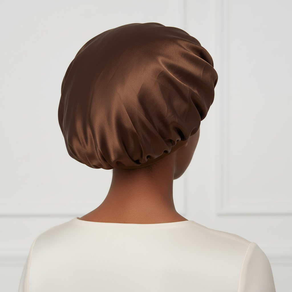 Protégez vos cheveux avec élégance et confort toute la nuit grâce à notre bonnet en satin marron.
