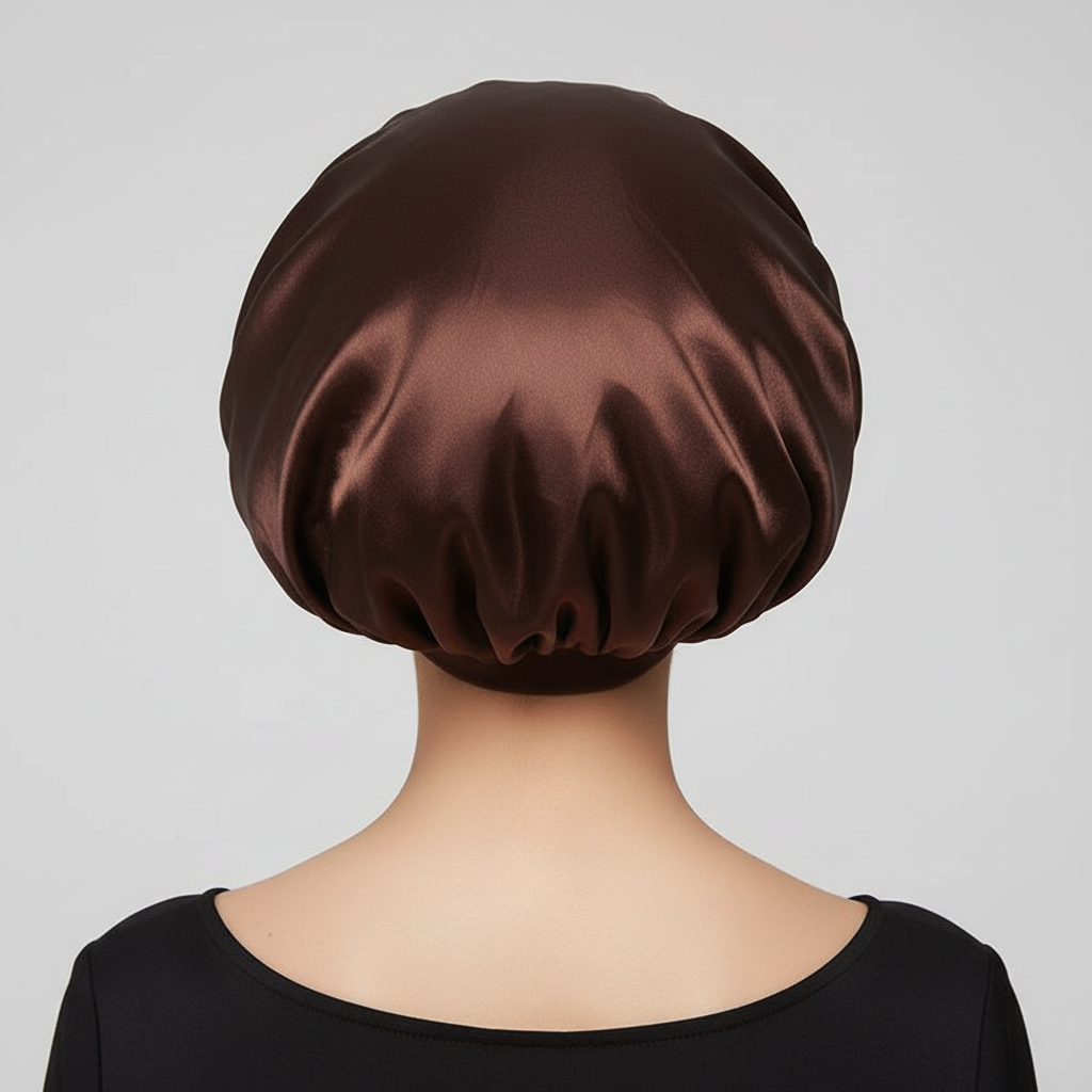 Ce bonnet est un accessoire capillaire destiné à être porté durant le sommeil. Sa conception en tissu satiné marron vise à couvrir et protéger la chevelure.