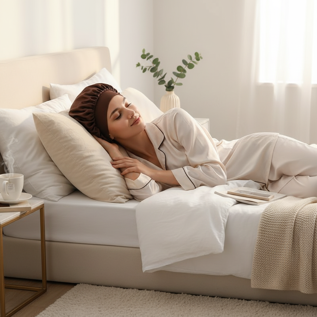 Le bonnet couvre la chevelure pendant la nuit. La surface lisse du tissu satiné a pour fonction de réduire les frottements des cheveux contre le linge de lit. Il maintient la coiffure en place et aide à limiter la perte d'hydratation capillaire due au contact direct avec les draps.