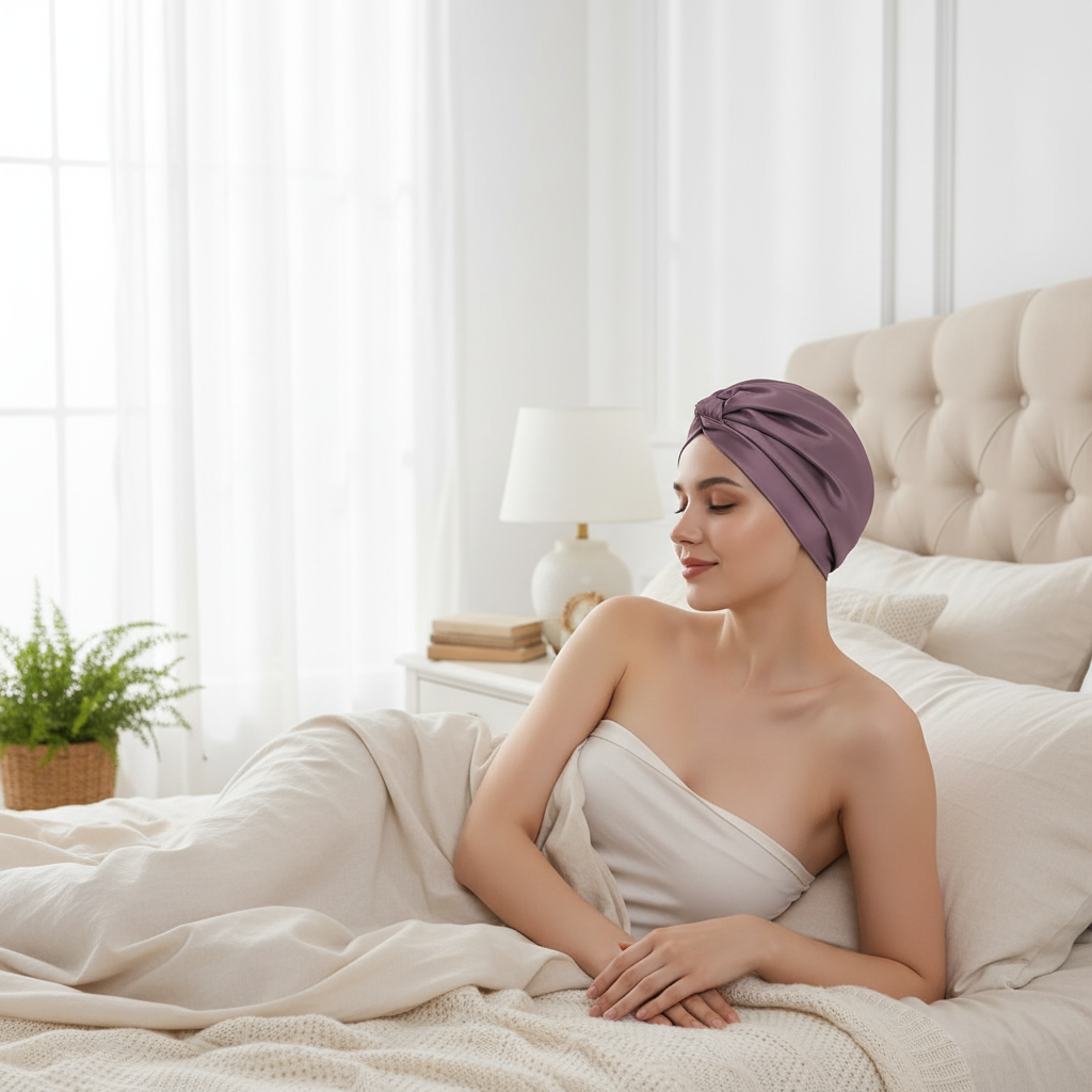 Le bonnet en satin est utilisé pour envelopper les cheveux afin de les protéger durant le sommeil ou lors de moments de détente. Sa surface lisse vise à réduire les frottements mécaniques des cheveux contre les surfaces, ce qui peut affecter la structure capillaire et l'hydratation.