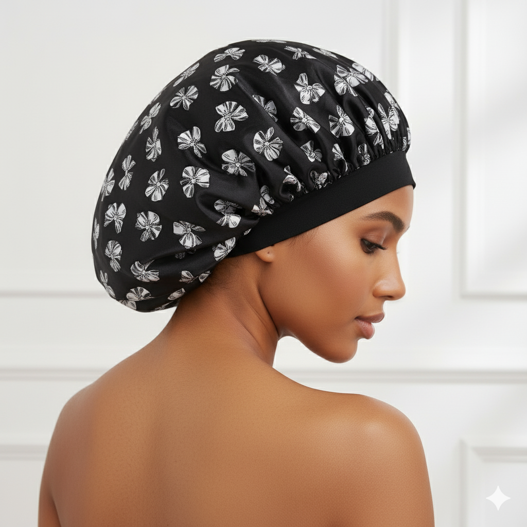 Bonnet de Nuit en Satin Noir à Motifs Nœuds – Couverture Capillaire Nocturne