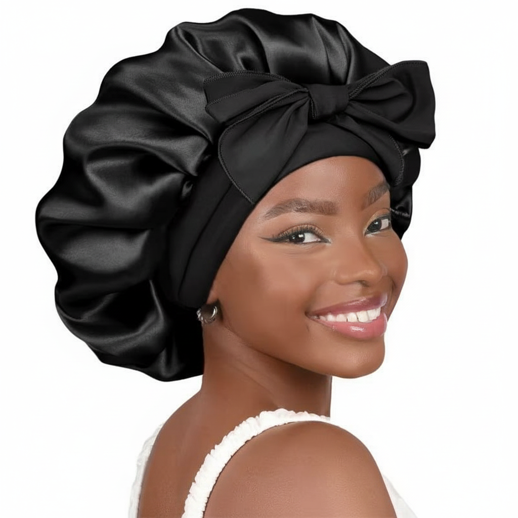 Ce bonnet de nuit en satin noir est doté d'un nœud décoratif sur le devant et d'un bandeau élastique pour le maintien sur la tête.