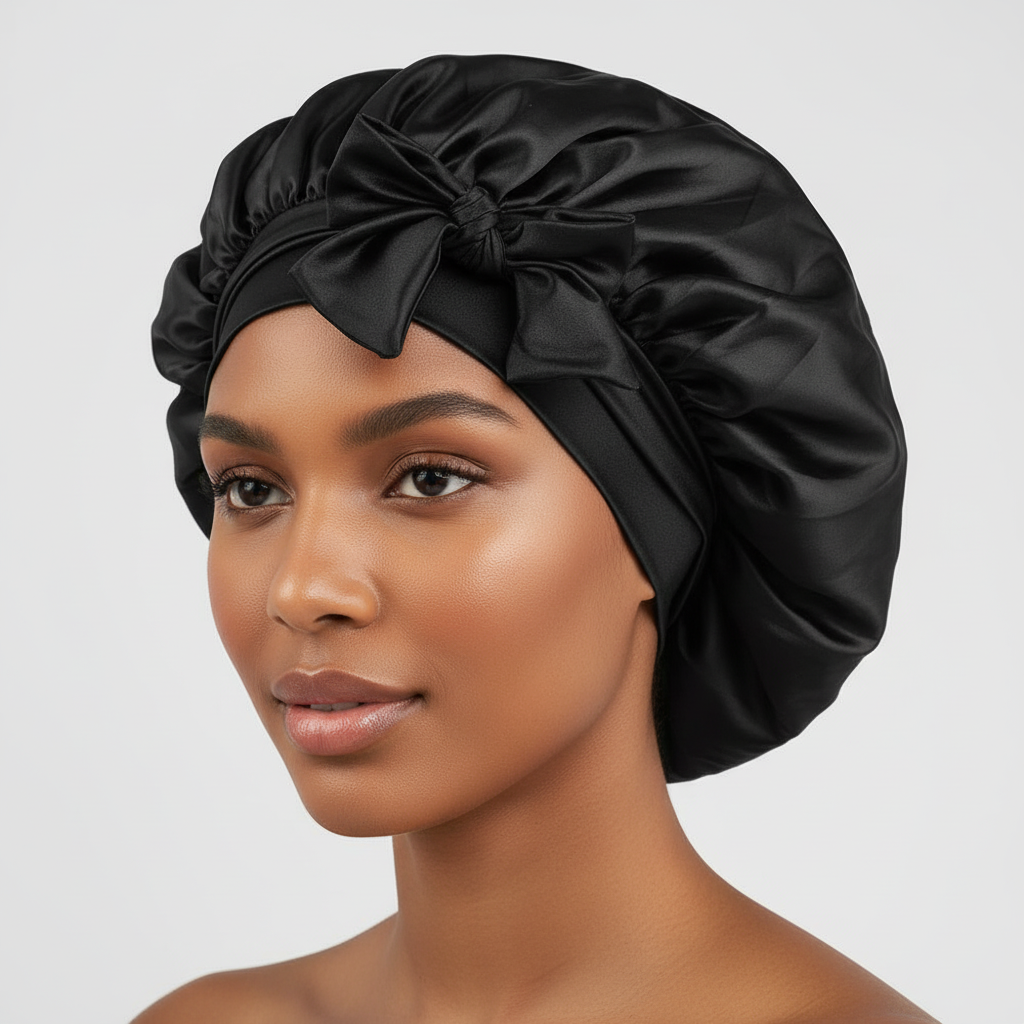 Bonnet En Satin Noir Avec Nœud Réglable Nuit