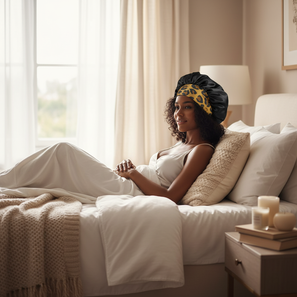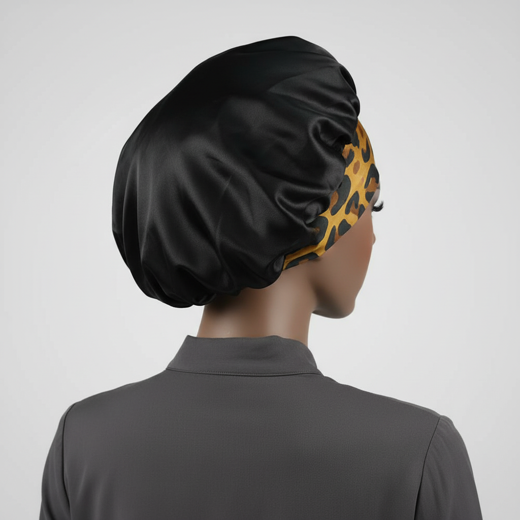 Bonnet En Satin Noir Et Léopard Pour Femme : Protection Capillaire Nocturne