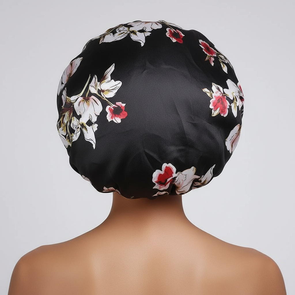Ce bonnet est un accessoire capillaire conçu pour être porté la nuit. Il est fabriqué en tissu satiné avec un motif floral et est doté d'une bande élastique de maintien.